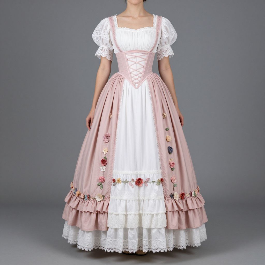 Woman wearing a Victorian-inspired crinoline dress featuring a white bodice with lace detailing, a pink corseted waist, and a flowing skirt adorned with ruffled layers and floral embellishments, set against a neutral gray background.