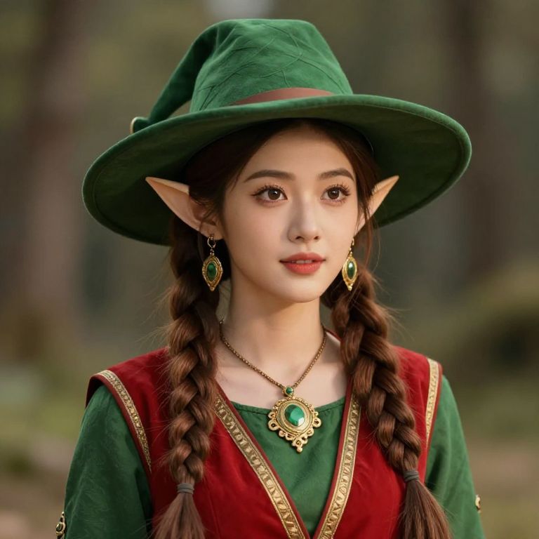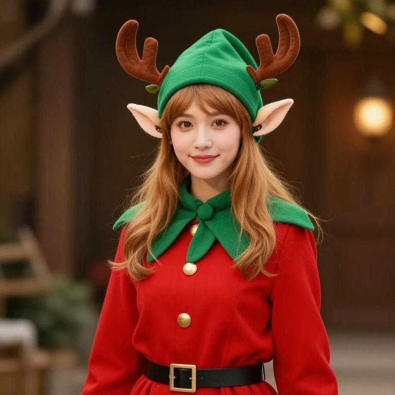 Female elf wearing a red outfit with a green hat and reindeer ears.