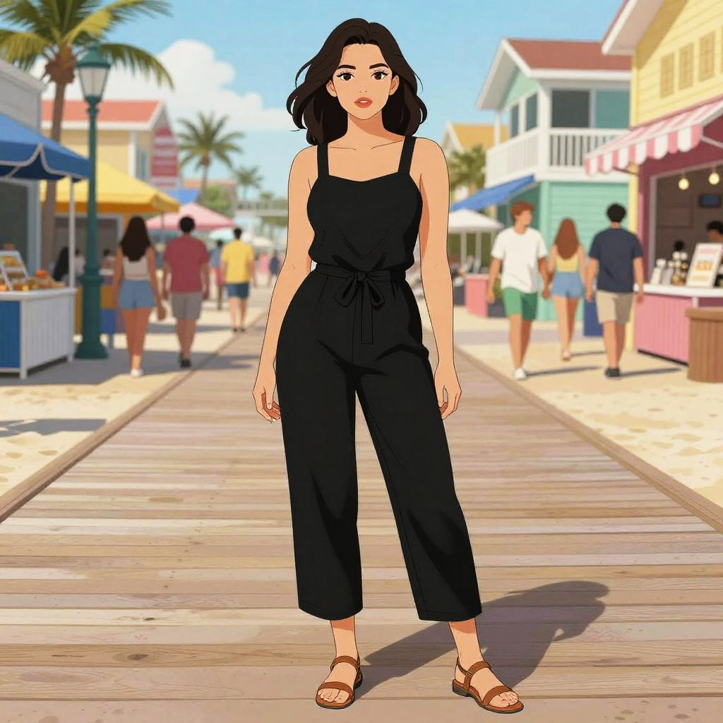 A busty woman in a casual chic sleeveless black jumpsuit with a relaxed fit and cinched waist, paired with brown strappy flat sandals, stands in a fashionable boardwalk in Virginia Beach, surrounded by vibrant beachgoers and colorful shops, illustrated in the style of Kodansha comics. Sexy. Pretty face and beutiful eyes
