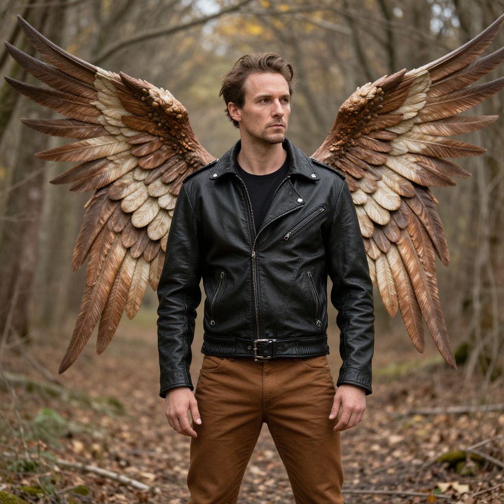 A man stands confidently in an outdoor forest setting wearing a black leather jacket and brown pants, with large, detailed brown and beige wings extending from his back. The dramatic and fantasy-inspired image blends rugged fashion with mythical elements, captured in warm, natural tones.