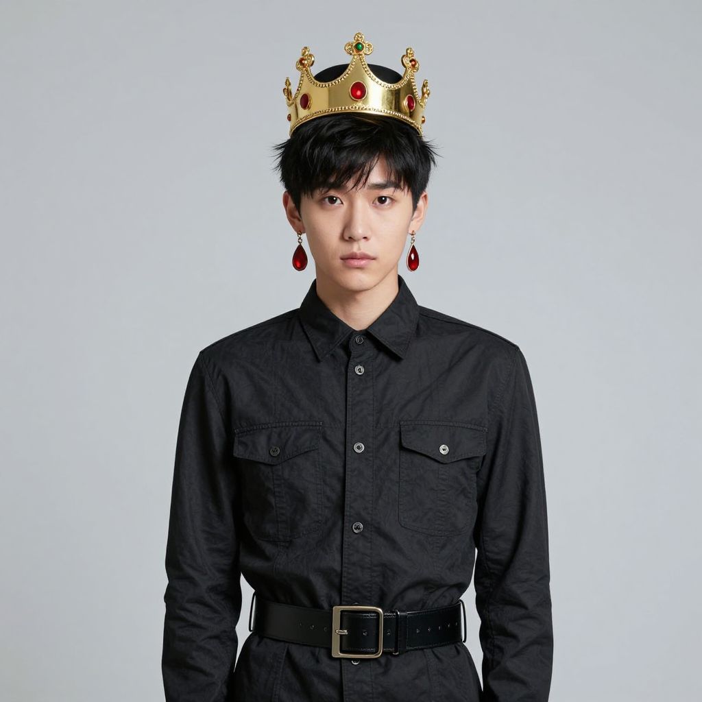Photograph of an East Asian male with fair skin, black hair, and neutral expression, wearing a golden crown adorned with red jewels and intricate patterns. He is dressed in a black, long-sleeved, button-up shirt with chest pockets and a black belt with a gold buckle. He also wears red, teardrop-shaped earrings. The background is a plain, light blue-gray color, and the subject is centered, looking directly at the camera. The overall style is formal and regal, with a modern, minimalistic backdrop emphasizing the subject's royal attire.
