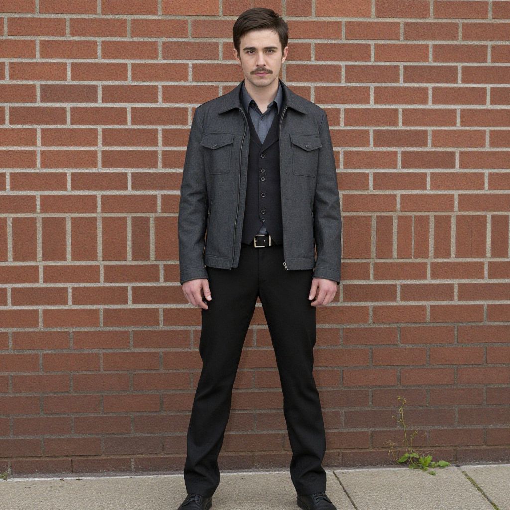 Photograph of a young man standing against a red brick wall. He has short, dark brown hair, a mustache, and a serious expression. He is wearing a black denim jacket over a black button-up shirt, black pants, and black shoes. His hands rest by his sides. The brick wall behind him is uniformly red with white mortar, and the concrete ground beneath him is slightly cracked. The overall style is modern and casual, with a slightly edgy, urban vibe. The lighting is natural, and the image is sharply focused.