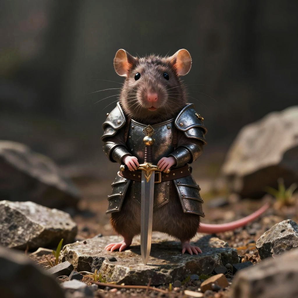 Rat full body, fantasy creature rat with miniature armor and a tiny sword, standing heroically on rocky terrain, epic lighting, high detail fantasy art style