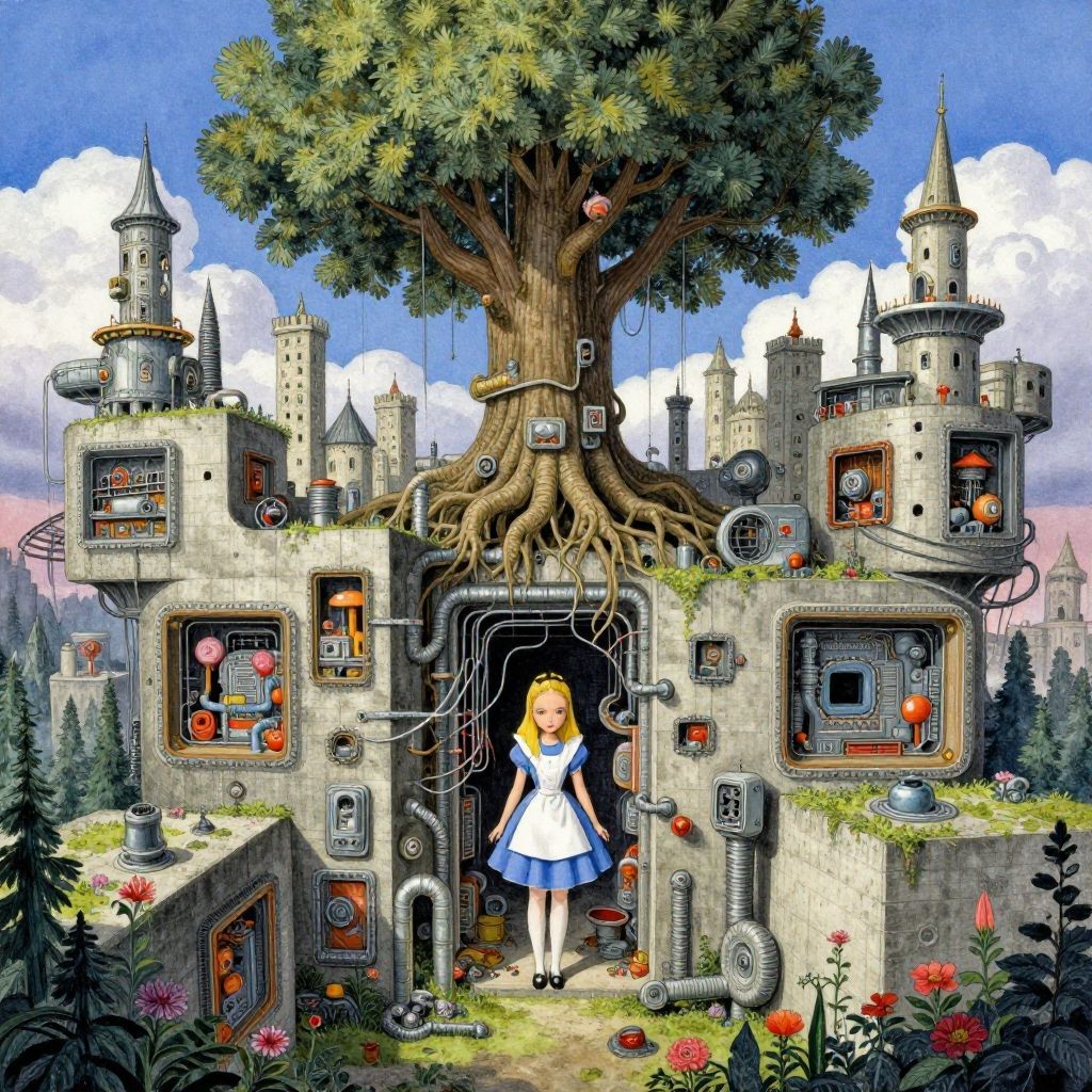 A fantasy painting, Art by escher, by Tsutomu Nihei, TNstyle, watercolor, (1girl, Alice, Alice in Wonderland), doll, doll amor, megastructure, concrete walls, pipes, frames, cables, weird, Bauhaus, Ancient European castles of the Middle Ages, Toa Heavy Industries, deep, chaotic, big tree, thick twisting tree roots growing in through the walls, deep forest, floral, (clear blue sky), clouds, thousands of years later, sci-fi, inspired by Nicole Eisenman, masterpiece, amazing quality, best quality, high quality, aesthetic, rich color palette, extremely detailed, intricately detailed, cinematic