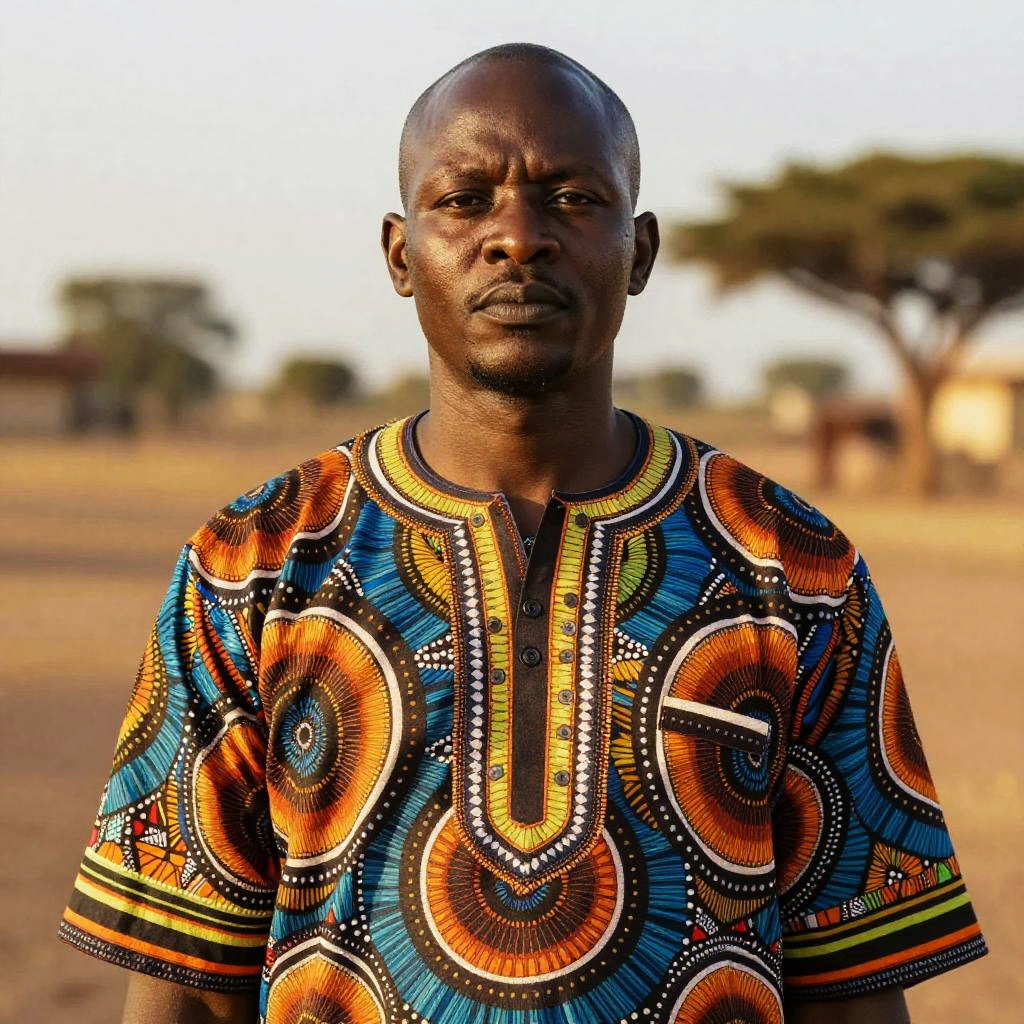 Photograph of a serious, bald African man with dark skin, wearing a vibrant, colorful, patterned traditional shirt, standing in a sunlit,