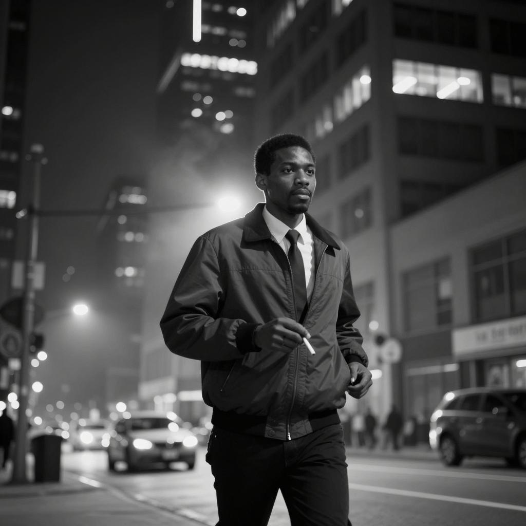 Man with dark skin, black suit, white shirt, red tie, hands in pockets, stands in doorway of red brick building. Vintage red Coca-Cola vending machine on left. Foreground shows blurry arm of person in car. Door behind man is wooden. Light from doorway illuminates man's face.