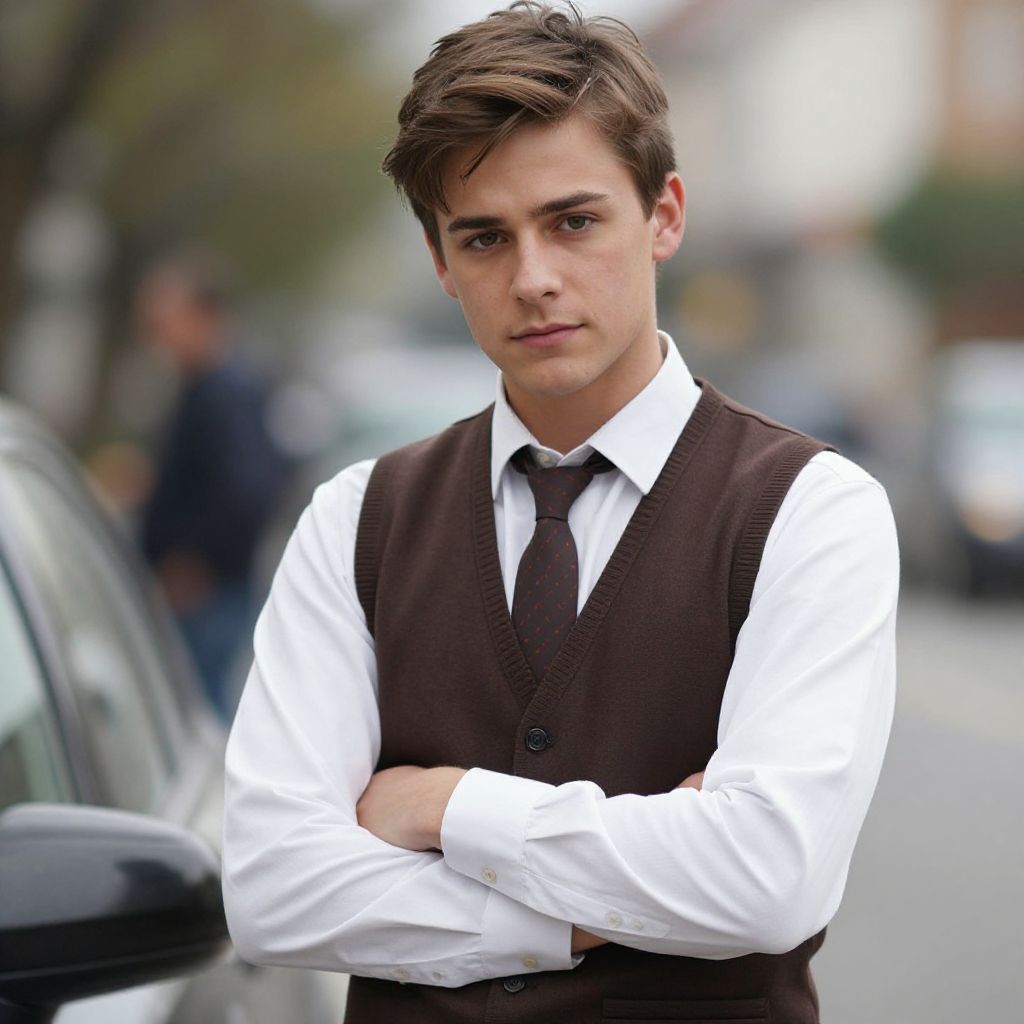 Photograph of a young Caucasian man with short, dark brown hair and fair skin, standing on a city street. He has a serious expression, with light blue eyes looking directly at the camera. He is wearing a white dress shirt with a brown sleeveless vest and a dark brown tie. His arms are crossed over his chest. The background is blurred, showing indistinct buildings and a car to the left. The overall style is realistic and the lighting is natural, suggesting an overcast day. The man's appearance is neat and formal.