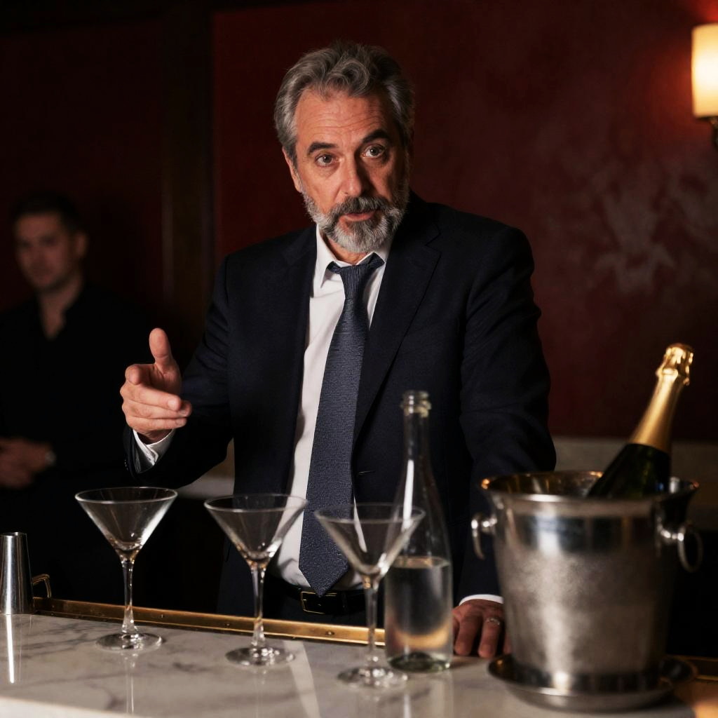 Middle-aged man with gray hair and beard in dark suit and tie, leaning on bar counter, right hand gesturing. On counter: two martini glasses, clear bottle, silver ice bucket with champagne bottle. Background: dimly lit, red patterned walls, blurred person.