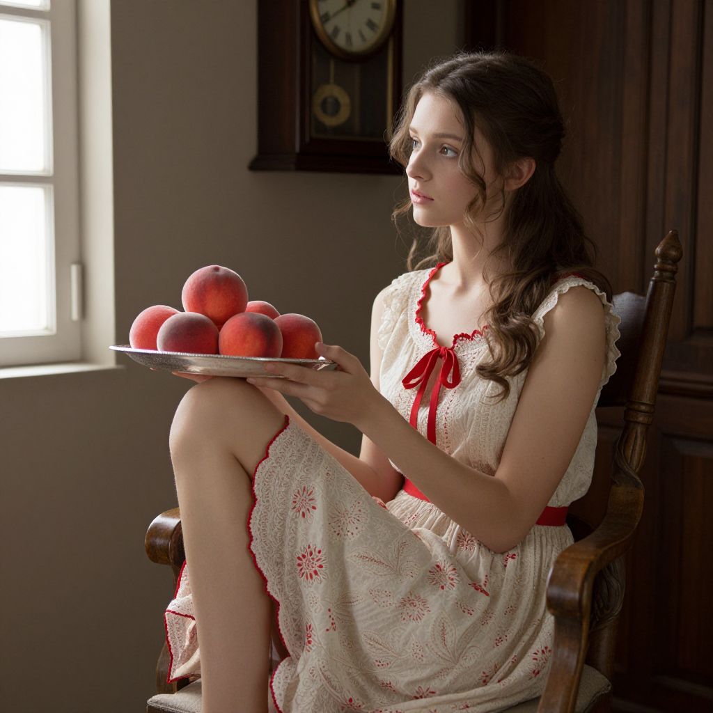 Seated gracefully in a wooden chair, a young woman adorned in a cream and red dress holds a silver platter filled with vibrant peaches, her gaze directed thoughtfully to the side, framed by a rustic interior featuring a wall clock above and a window to the left.