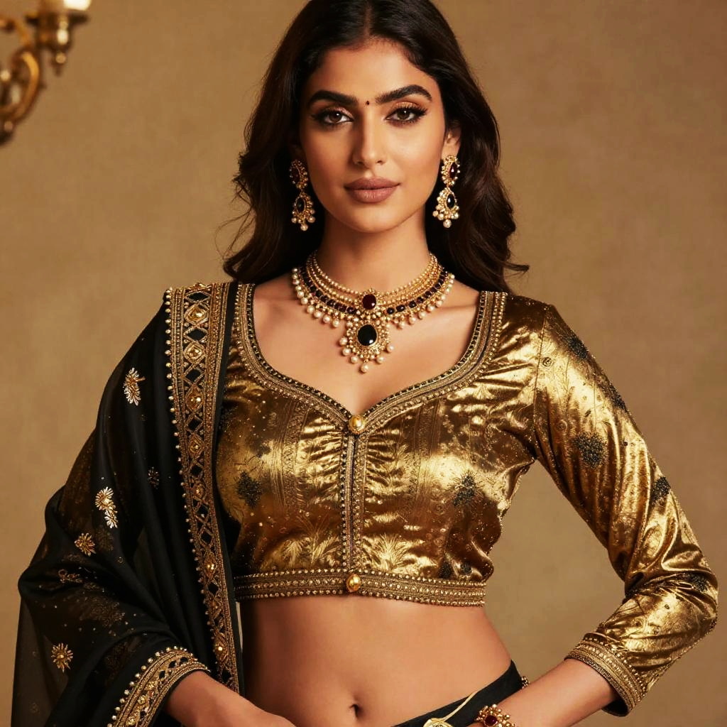 Photograph of a beautiful Indian woman with dark hair, wearing a gold embroidered crop top, black saree, and intricate jewelry, standing against a beige