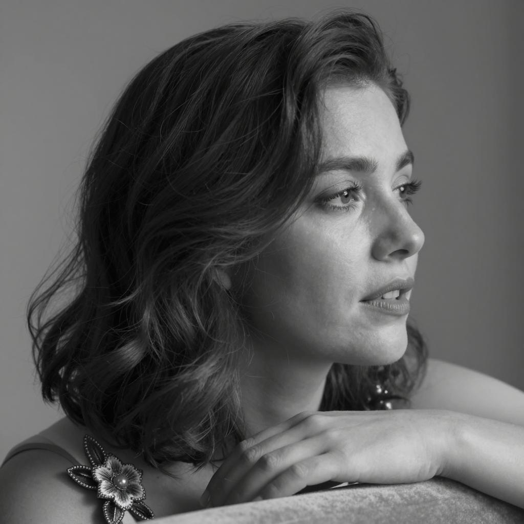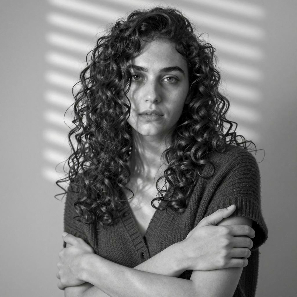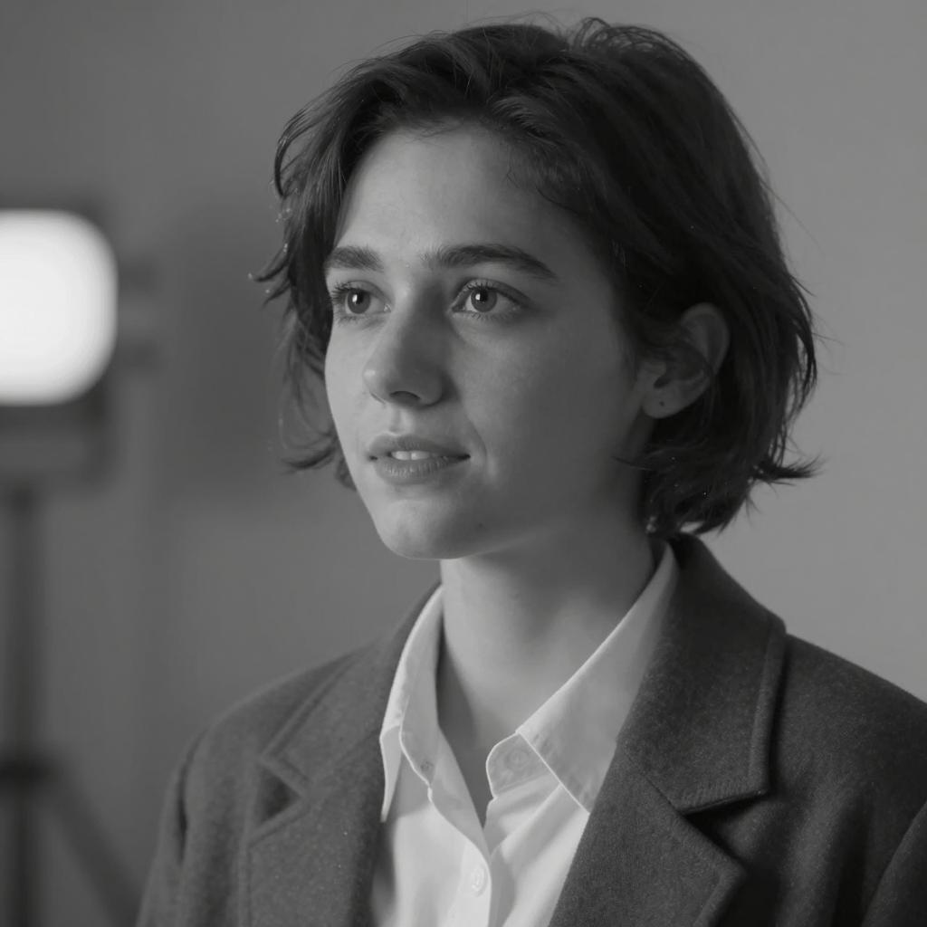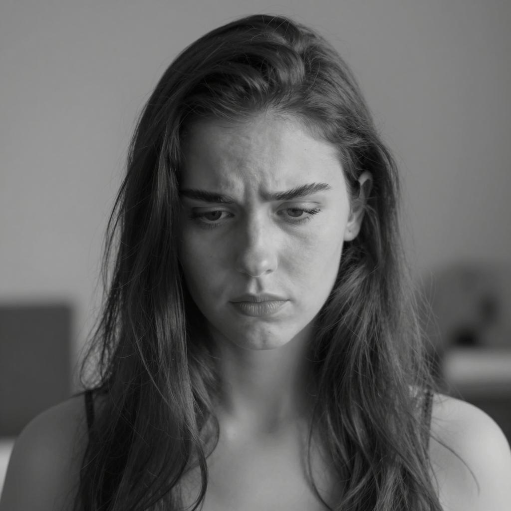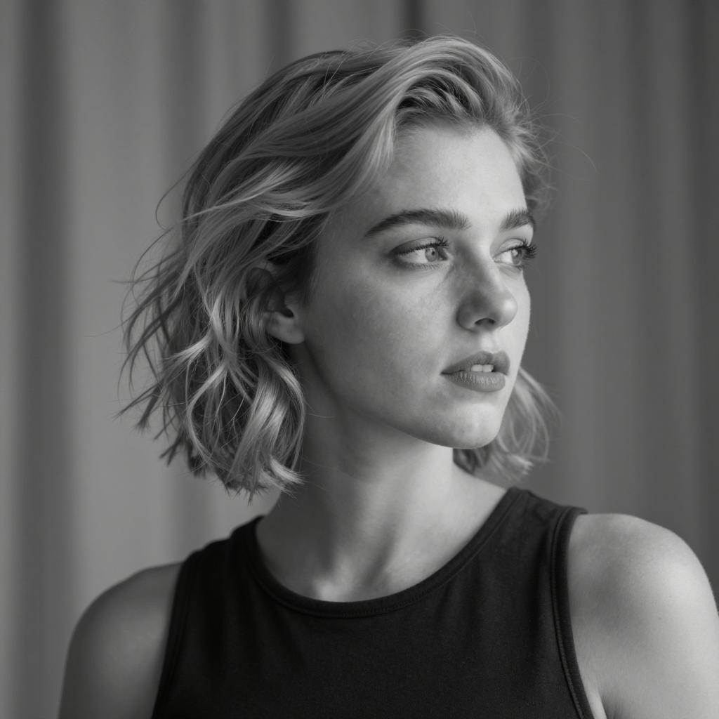 Black and white photograph of a woman with short, wavy hair, wearing a sheer top, standing by a window with semi-transparent curtains. She looks to the left with a concerned expression. Her right hand rests on the curtain. The window light casts shadows on her face. The curtain ure is slightly grainy.