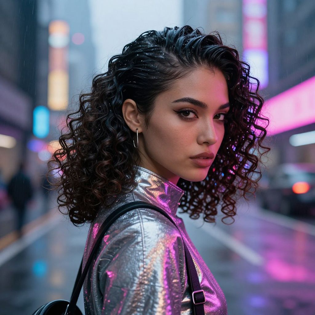 Slick back curly hair woman in a futuristic cyberpunk city, vibrant neon colors reflecting on her shiny, slicked-back curls, wearing a metallic outfit, rain-soaked streets, blending modern fashion with sci-fi elements