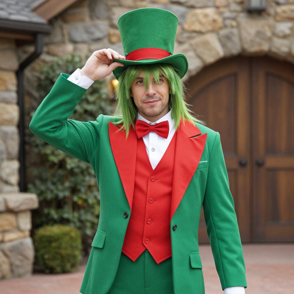 Photograph of a man with long green hair and fair skin, dressed as a magician. He wears a green top hat with a red band, a green jacket with red lapels, a red vest, white shirt, and red bow tie. He is smiling and adjusting his hat with his right hand. The background features a stone building with a wooden door and greenery to the left. The image has a vibrant, colorful style with sharp focus on the man, contrasting with the slightly blurred background.