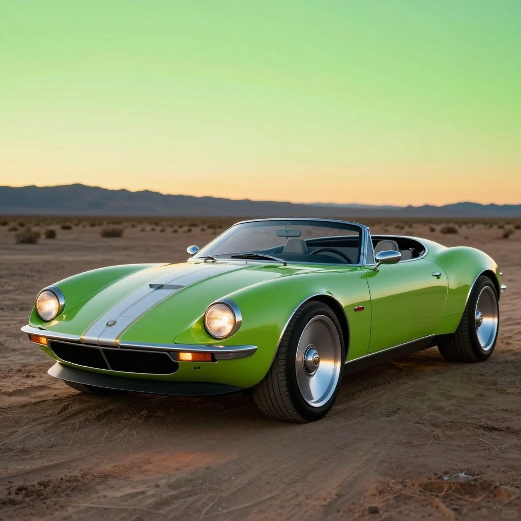 Syd mead style, concept art, a futuristic chartreuse and steel convertible, pop up headlights and concave rims, white and gold stripes retrofuturism, 1970s, mojave desert, sunset, neon, background is lime green, photorealistic, leica summilux, fuji velvia