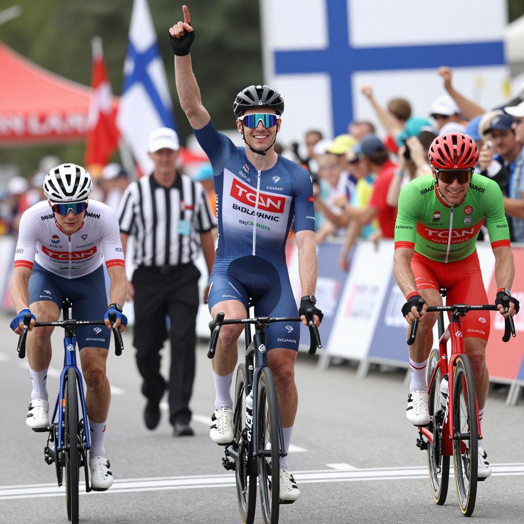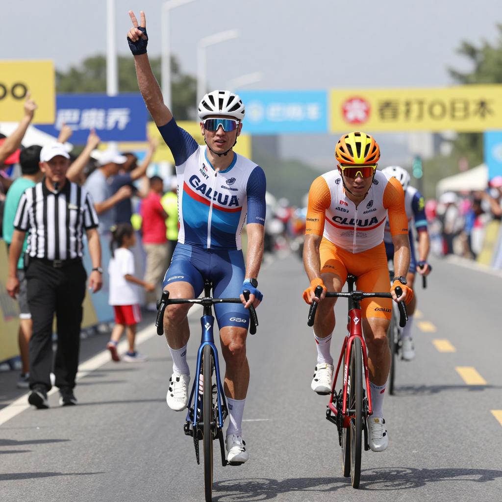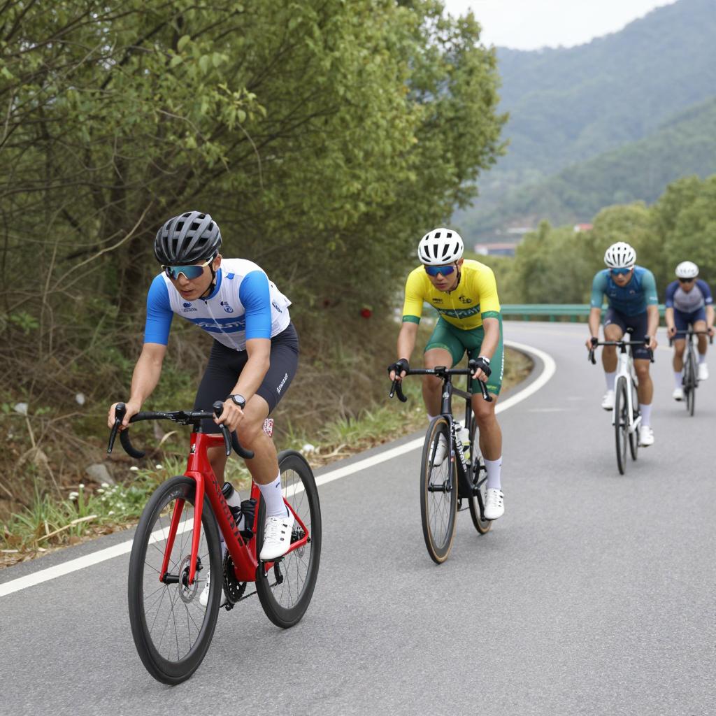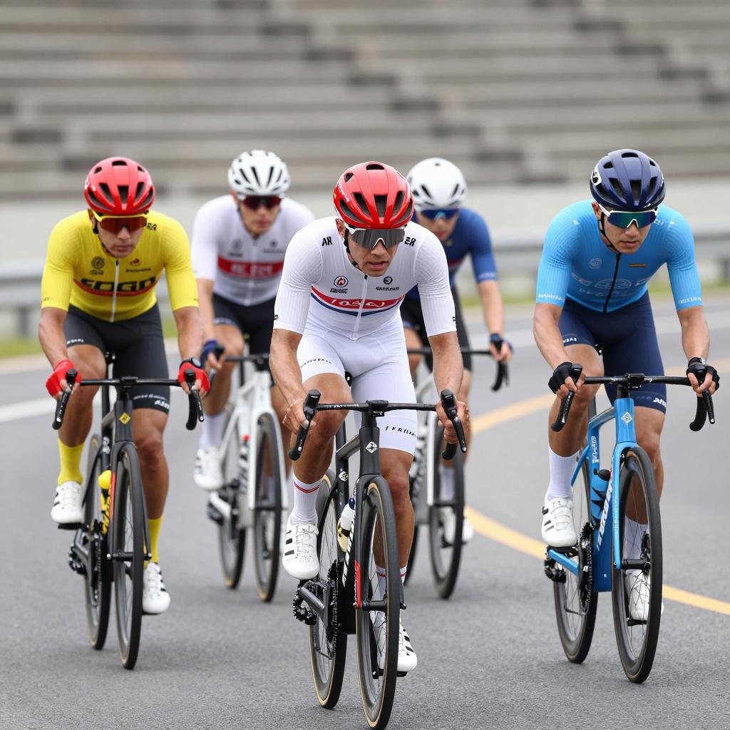 Five male cyclists in a race. Foreground: white-shirted cyclist with red helmet, intense expression, leaning forward. Left: yellow-shirted cyclist in red helmet, focused. Right: blue-shirted cyclist in blue helmet, determined. Background: white-shirted cyclist, slightly blurred. Background: empty stadium. Cyclists wear tight shorts, helmets, and race shoes. Road is gray with yellow lines.