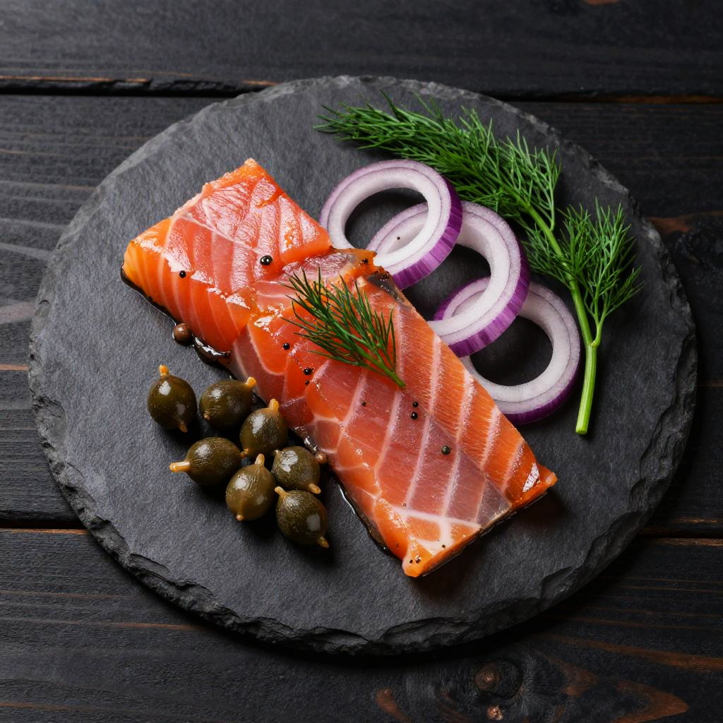 Top-down photo of a stone slab with smoked salmon slices, capers, red onion rings, and dill garnish, on dark wood, moody premium lighting, professional food photography, empty space for text in the corner