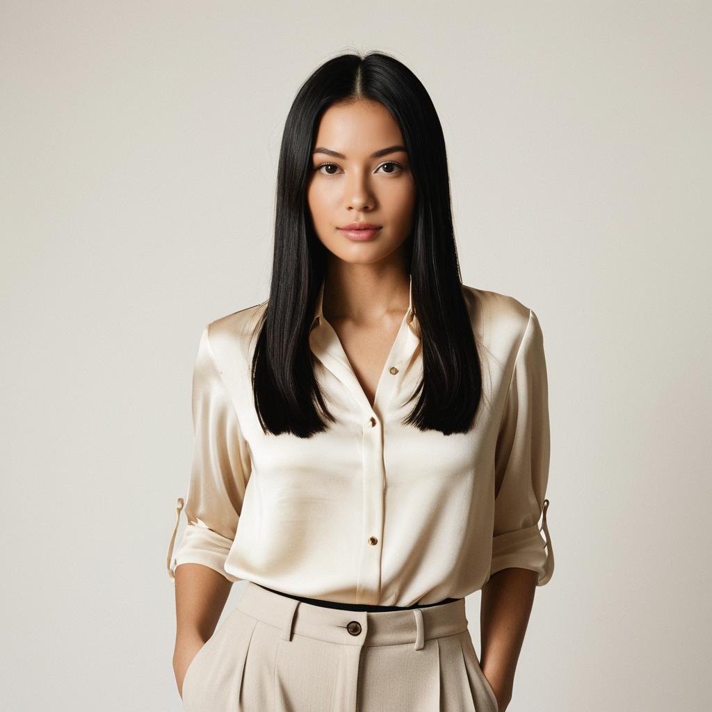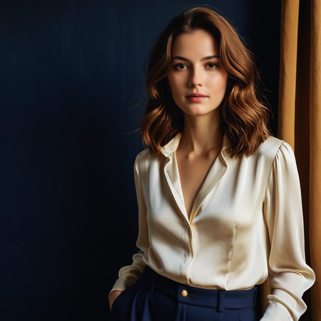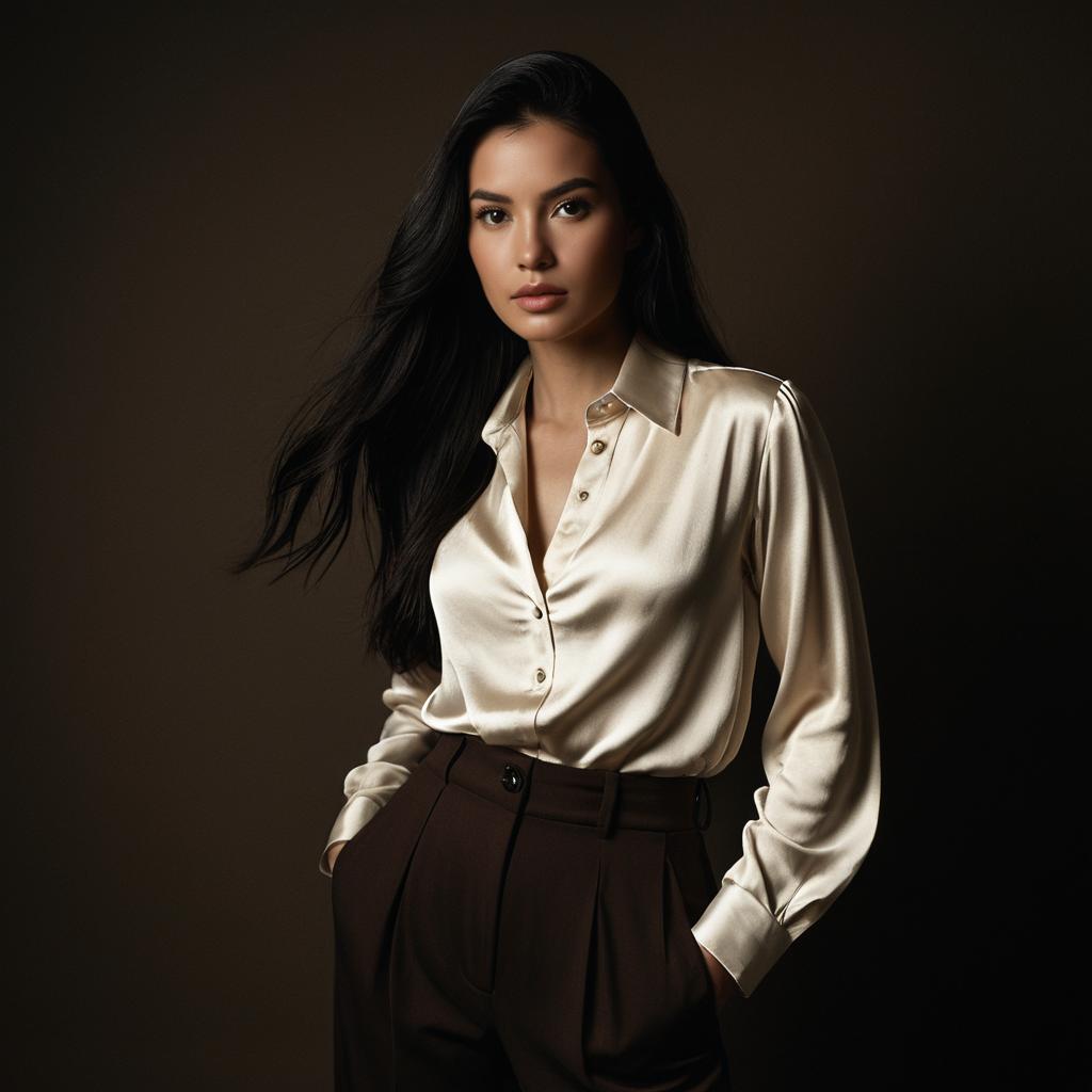 A realistic portrait of a sexy woman with slicked back jet black hair and piercing green eyes, wearing a flowing cream silk blouse tucked into high-waisted trousers, warm natural lighting accentuating smooth skin texture, warm brown and beige colors, detailed facial features, deep emerald green velvet curtain background