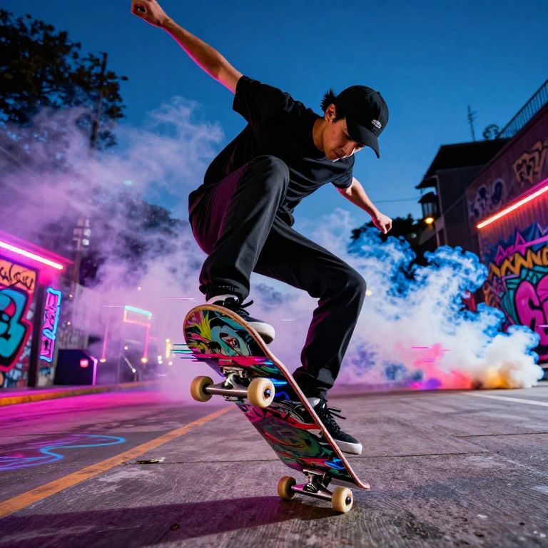 A vibrant, glitched photograph of a skateboarder performing a trick on a street with neon smoke and graffiti in the background, captured with an ultra-wide angle lens and high detail.