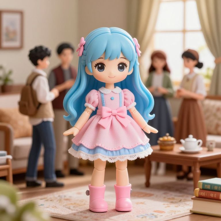 A cute female doll with soft, flowing blonde hair and large, expressive blue eyes, wearing a charming blue outfit that includes a blue hoodie with a playful design, paired with white sneakers that add a youthful and vibrant touch. The doll has a gentle, innocent expression, standing in a sunny, softly lit room with a cozy, homey atmosphere. The overall style is whimsical and colorful, blending realism with a touch of fantasy, highlighting the doll's detailed features and cheerful personality.