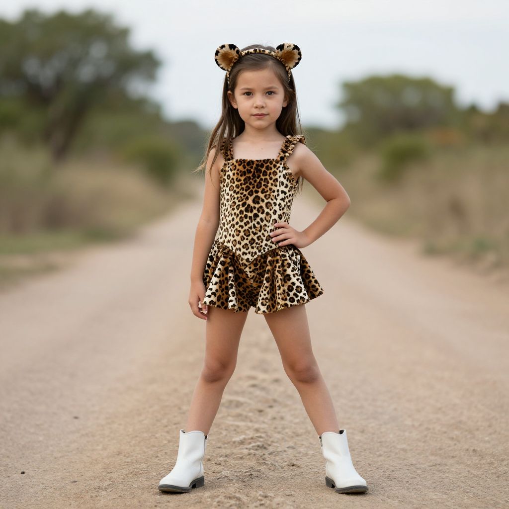 Photograph of a young girl standing confidently on a dirt road, wearing a leopard-print dress, matching headband with cat ears, and white cowboy boots