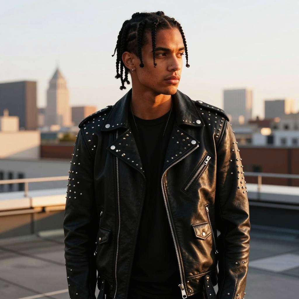 A young man with braided hair stands on an urban rooftop during golden hour, wearing a detailed black leather jacket with metallic studs and zippers. The warm sunlight softly highlights his features and the city skyline in the background, creating a moody and stylish portrait.