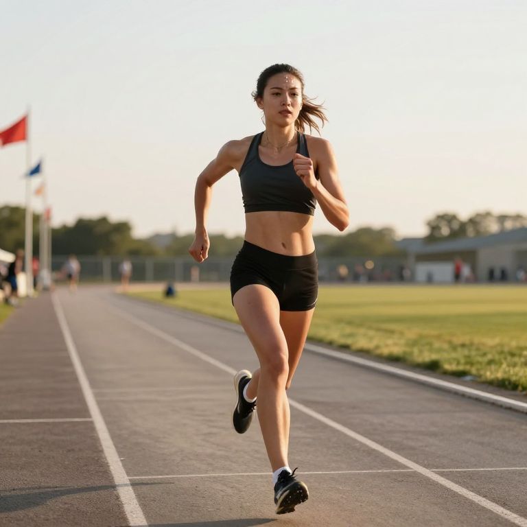 A female runner in her late twenties with a strong jawline and confident posture, sprinting down a concrete track at a sports event, sweat glistening on her forehead, the finish line visible in the distance with flags waving in the breeze, golden hour lighting highlighting the scene.