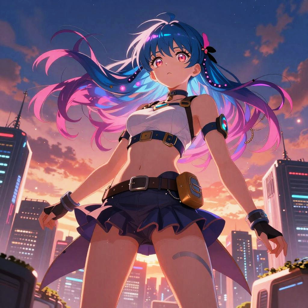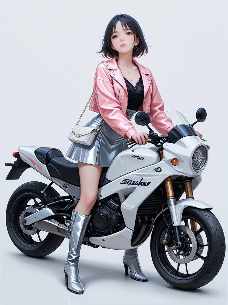 Mechanic anime girl standing confidently next to a sleek motorcycle, wearing a leather jacket and tool belt, neon cityscape at night behind her, cyberpunk vibes, colorful lighting, dynamic composition, expressive anime character design