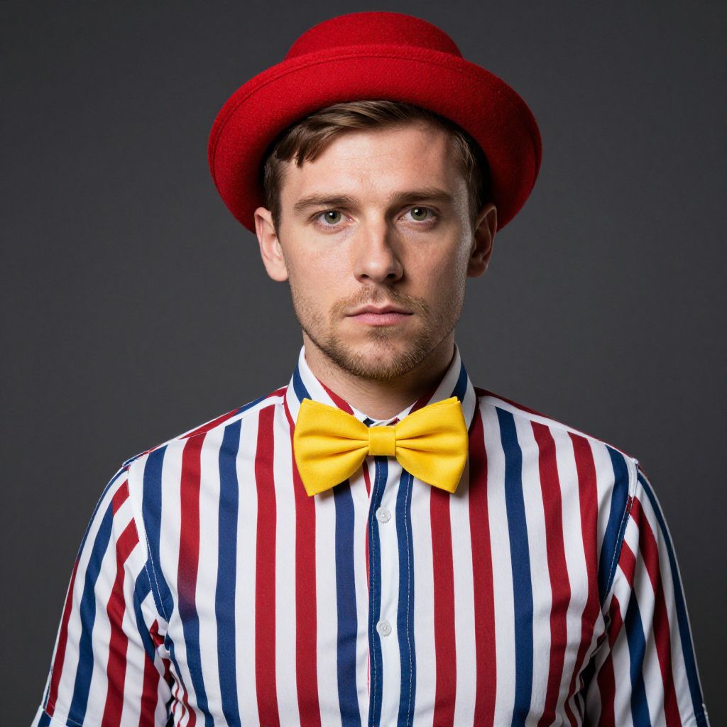 Photograph of a young Caucasian man with short brown hair and light stubble, wearing a red felt hat and a yellow bow tie. He has a neutral expression and is dressed in a long-sleeved shirt with vertical red, white, and blue stripes. The background is a solid dark gray, making the colorful attire stand out. The image has a studio lighting setup, highlighting the subject's face and clothing. The overall style is modern and playful, with a focus on bold, contrasting colors.