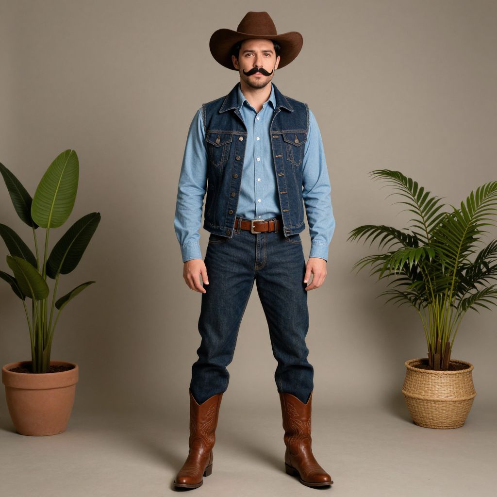 Mustache costume character, 1boy, male focus, solo, brown footwear, facial hair, mustache, boots, shirt, brown belt, belt, pants, jacket, standing, full body, cowboy boots, looking at viewer, hat, collared shirt, potted plant, denim, black hair, blue shirt, vest, long sleeves