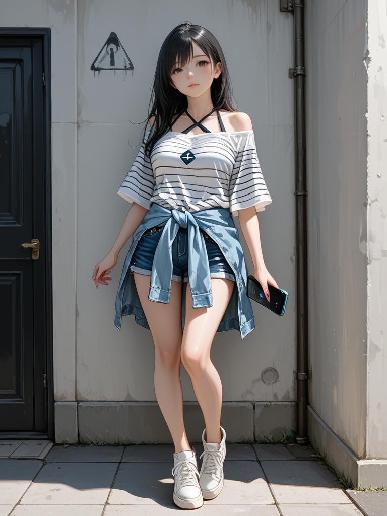 CGI anime-style woman with blue hair, wearing black shorts and blue crop top, standing confidently with black bicycle in industrial alley.