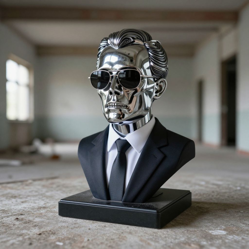 Photograph of a metallic silver bust sculpture of a man with styled hair, wearing black sunglasses, a black suit, white shirt, and black tie. The bust is mounted on a black rectangular base and positioned on a concrete floor in an abandoned, dimly lit room with worn, peeling paint and a large window on the left. The background is blurred, emphasizing the reflective surface of the bust. The overall style is modern and slightly futuristic.