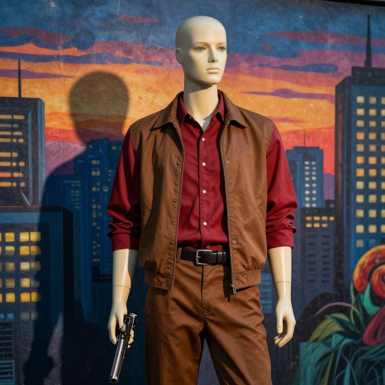 A detailed mannequin wearing a brown outfit with a red shirt and a black belt, standing confidently in front of a vibrant, large mural depicting a cityscape at dusk. The mannequin has a realistic, slightly weathered texture, with expressive, neutral eyes and a slightly tilted head, giving it a watchful, mysterious presence. In his left hand, he holds a sleek, modern handgun with a faint metallic sheen, and his right hand is relaxed at his side. The mural behind him features bold colors and abstract city elements, adding depth and atmosphere to the scene. The lighting is soft golden hour, casting long shadows and highlighting the contrast between the mannequin's stillness and the dynamic background.