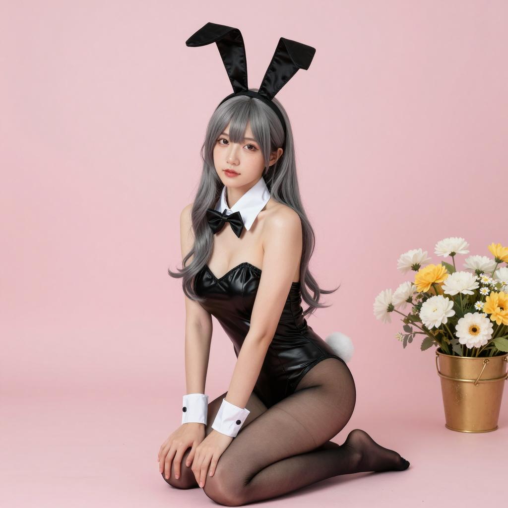 Young woman with long gray hair, black bunny ears, and white collar, kneeling on floor. Black strapless bunny suit, white cuffs, black bow tie, sheer black stockings, black bunny tail. Light pink background, bouquet of white and yellow flowers in gold basket on right. Soft lighting. She looks slightly to camera with neutral expression. Photographic image.