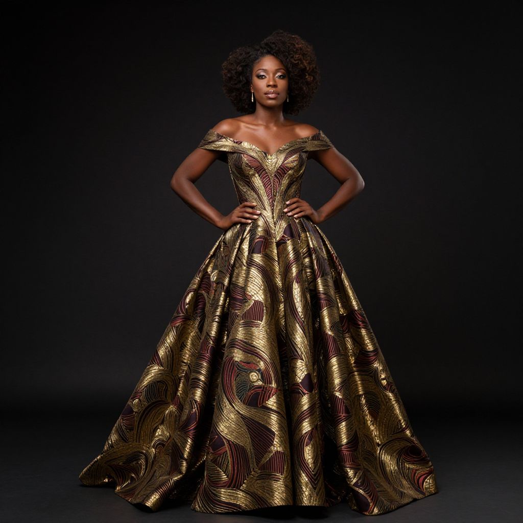 Photograph of a dark-skinned woman with curly hair in an off-the-shoulder, gold and black patterned, floor-length gown, standing
