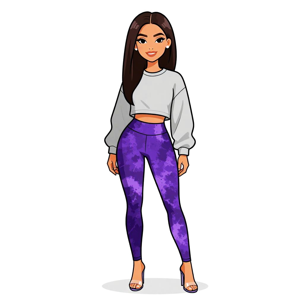 Illustration of a fit woman wearing black mesh crop top with high neckline and sleeveless design, paired with high-waist purple leggings featuring mesh panel inserts. She has a ponytail hairstyle and is wearing black sports sneakers. The background is white studio style.
