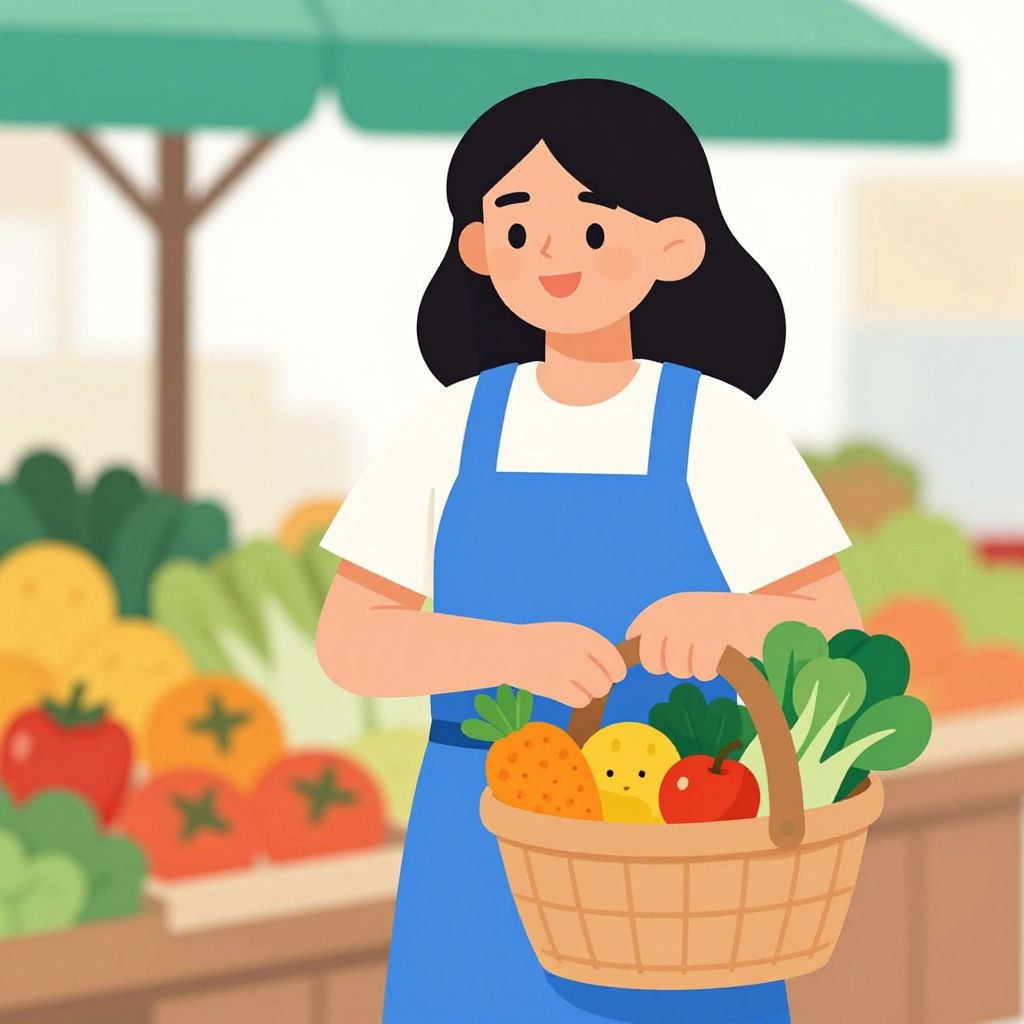 Cartoon-style illustration of a smiling woman with black hair, wearing a white shirt and blue overalls, holding a basket of fresh vegetables at a colorful