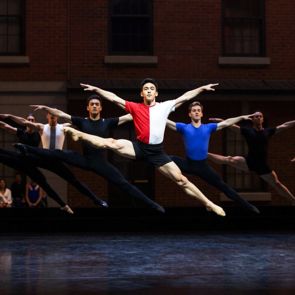 Three ballet dancers dressed in white and gold costumes perform center stage with arms outstretched. The background features dark stage lighting and blue panels displaying 'AGBA THE MOVIE' along with silhouettes of dancers. Four male musicians in white suits and black ties play guitars on either side of the stage.