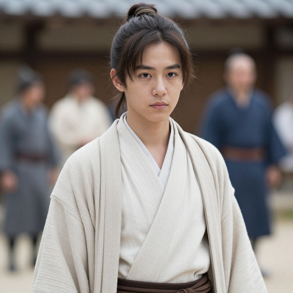 Photograph of a young Asian male model with short black hair, standing confidently in the center. He wears a white, long-sleeved traditional garment with intricate brown embroidery on the sleeves and a matching brown sash around his waist. The background features a blurred crowd of diverse people, including men and women of various ages, dressed in casual and traditional clothing. The scene takes place outdoors with wooden structures and trees visible in the background. The model's expression is serious, and the overall atmosphere is cultural and traditional.