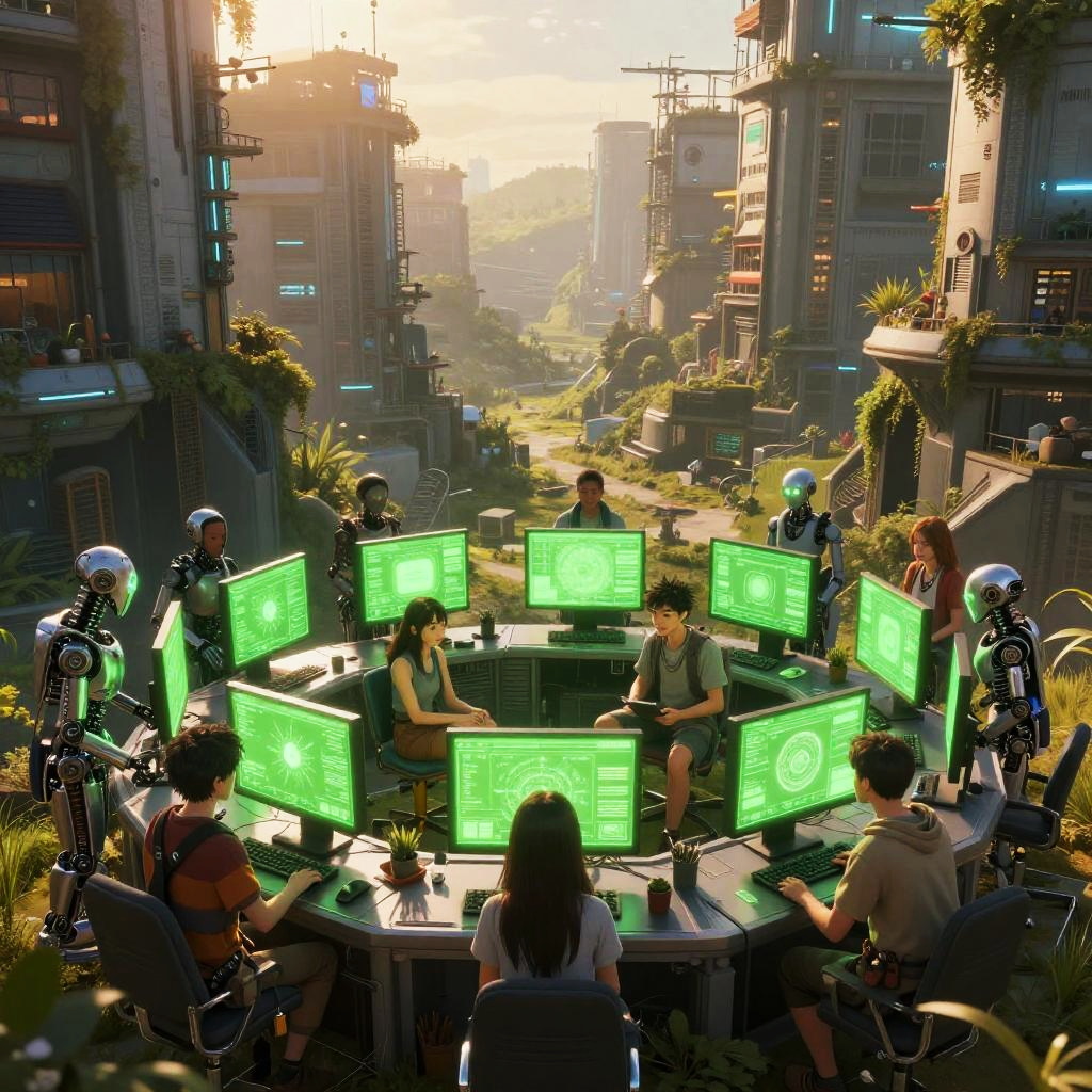 A cinematic composition depicting : we're overlooking a cyberpunk civilization in the valley with overgrown buildings, where a solarpunk tribe is peacefully collaborating with their android helpers with their bright green computer screens, octane render, hyperrealistic, at sunrise, by edward hopper jesper ejsing, by rhads, makoto shinkai and lois van baarle, ilya kuvshinov, rossdraws