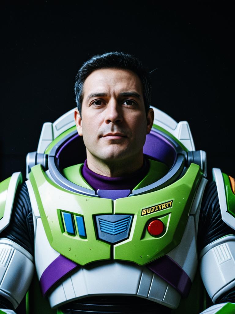 Man in Buzz Lightyear costume, cinematic realism, sharp portrait
