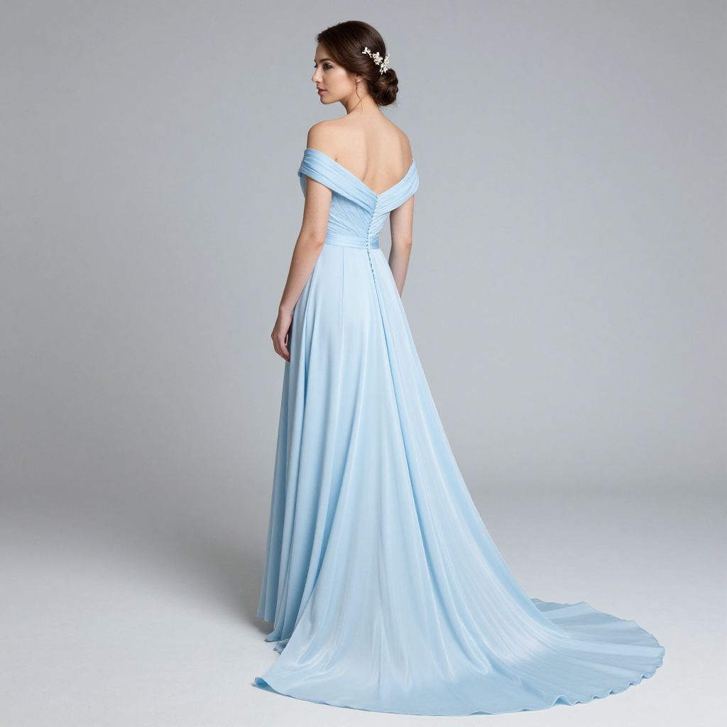 Photograph of a young woman standing against a plain, light gray background. She has fair skin, dark brown hair styled in an updo with a small white floral hairpiece. She is wearing an elegant, off-the-shoulder, light blue satin gown that hugs her slender frame and has a subtle ruched bodice. The gown features a long, flowing train that extends to the floor. Her expression is calm, and she gazes slightly to the side. The lighting is soft, highlighting the smooth texture of the satin fabric and the delicate details of the gown.