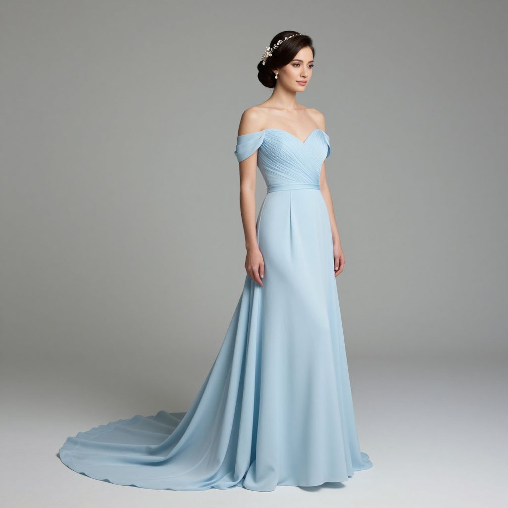 Elegant woman wearing a flowing light blue wedding dress with off-the-shoulder sleeves and a cascading train, complemented by a delicate floral hair accessory, stands gracefully against a minimalist background.