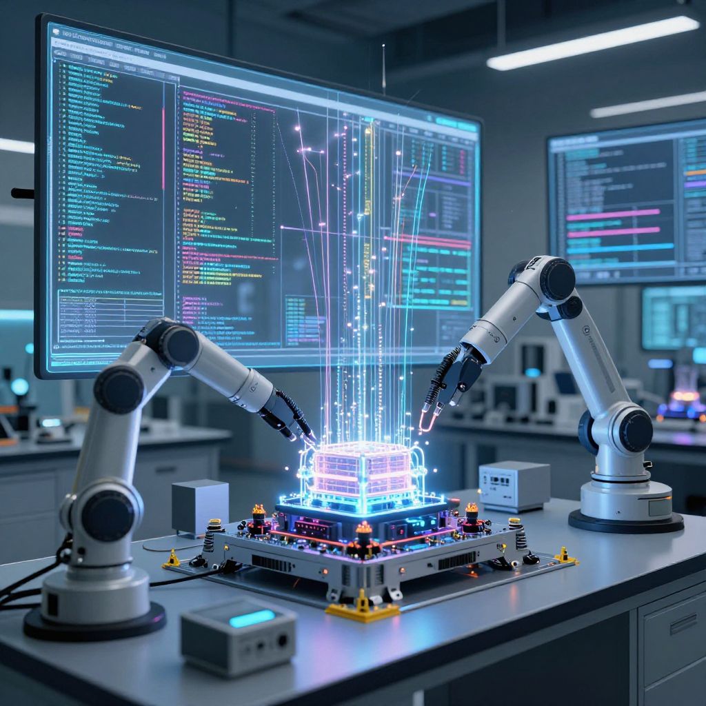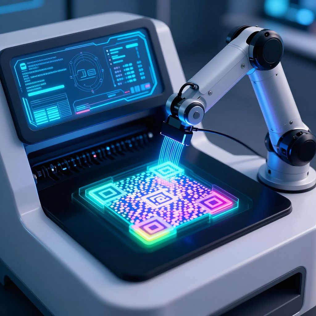 Close-up of an AI QR code generator machine, vibrant LED lights showcasing dynamic QR codes being created in real time, robotic arms assembling data streams, sci-fi inspired control panel with holographic data visualization, ultra-modern and sleek design.