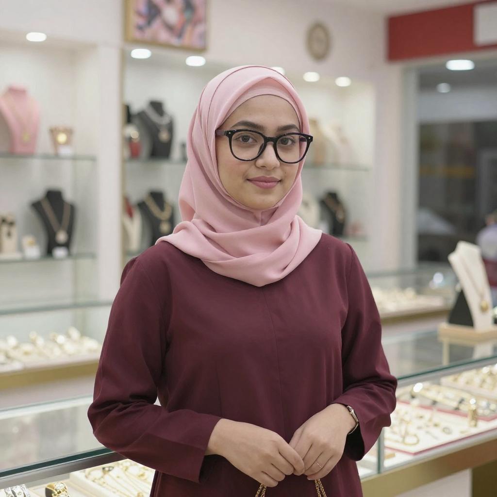 Photograph of a young woman with light skin, wearing a pink hijab, black-rimmed glasses, and a maroon long-sleeve top. She stands in a brightly lit jewelry store, hands in front, with a counter and display cases in the background.