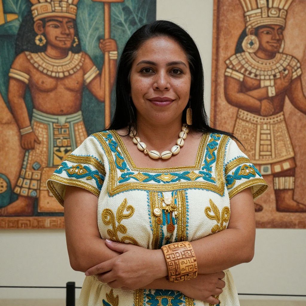 Photograph of a smiling Indian woman with long black hair, wearing a traditional Mayan-inspired white dress with gold and blue patterns, large shell necklace,