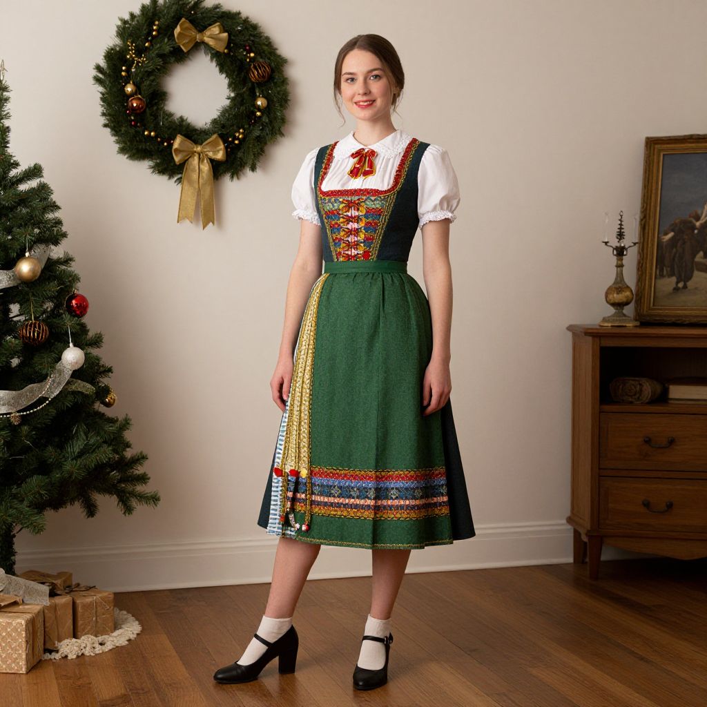 Photograph of a smiling woman in a traditional German Dirndl dress, standing in a festive room with a Christmas tree, wreath, and wooden furniture