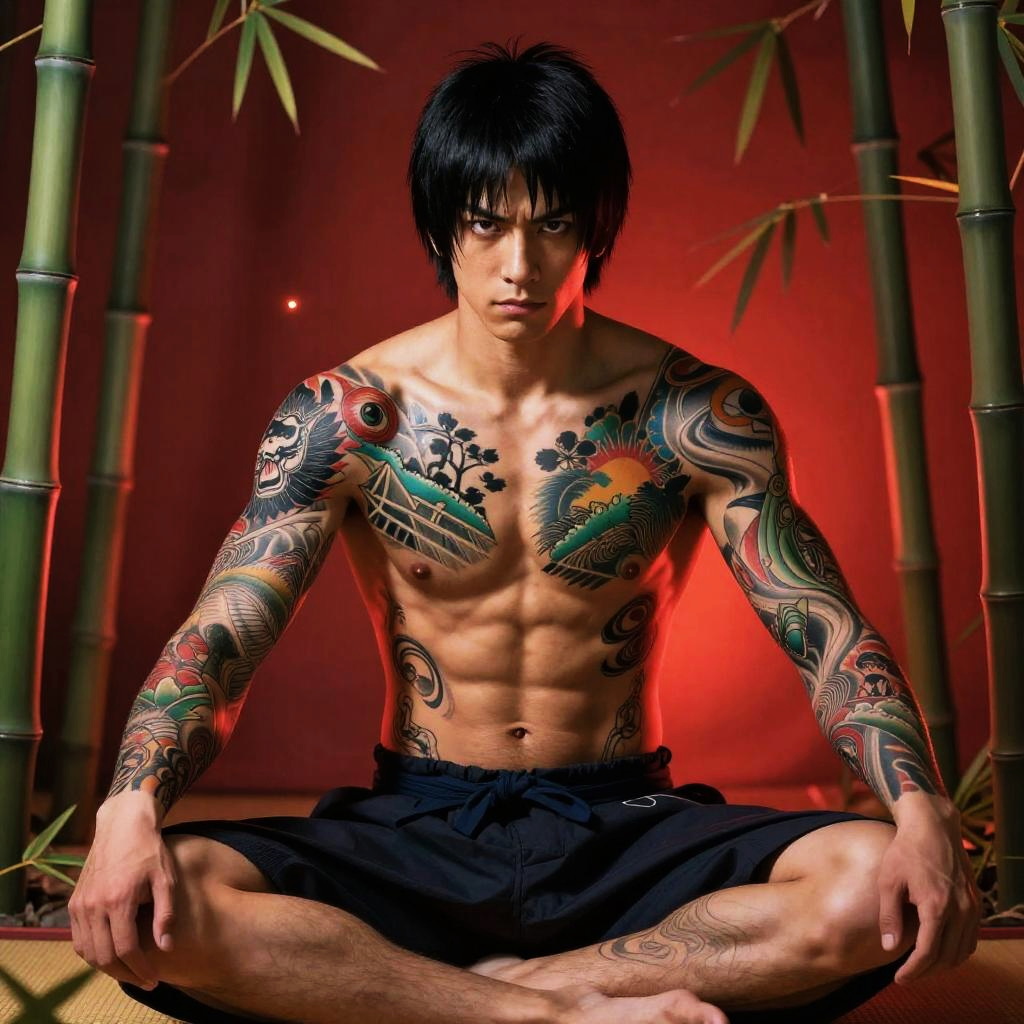 (YakuzaTattoo in body, chest, both arms tattoo:1.25), (1boy sitting in a japanese dojo:1.2), (topless, shorts, navel:1.2), (short hair, black hair, brown eyes:1.2), looking at viewer, from behind, bamboo, muscular, (detailed ladscape, red background:1.2), (dynamic_angle:1.2), (dynamic_pose:1.2), (red backlighting:1.3), (realistic:1.4), ((realism)), (masterpiece:1.2), (best quality), (ultra detailed:1.2), (8k, 4k, intricate), (canon R5, 50mm focal length, f/5.6), (cowboy shot:1), (85mm), light particles, lighting, (highly detailed:1.2), (detailed face:1.2), (gradients), colorful, (detailed eyes:1.2), (ultra photorealistic:1.2), (detailed skin:1.2)