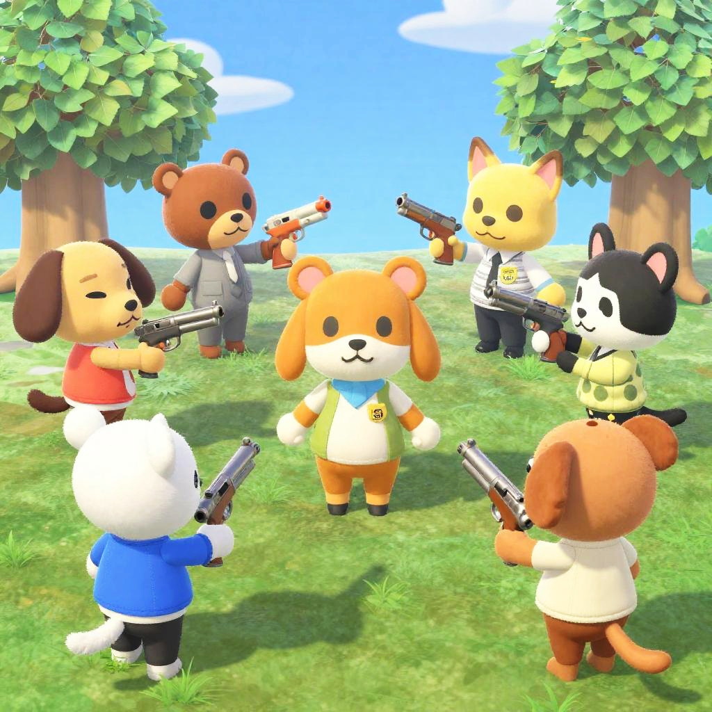 Animal Crossing with guns, cute animal characters in a colorful forest armed with sleek sci-fi weapons, mix of innocence and action, detailed environment, dynamic poses