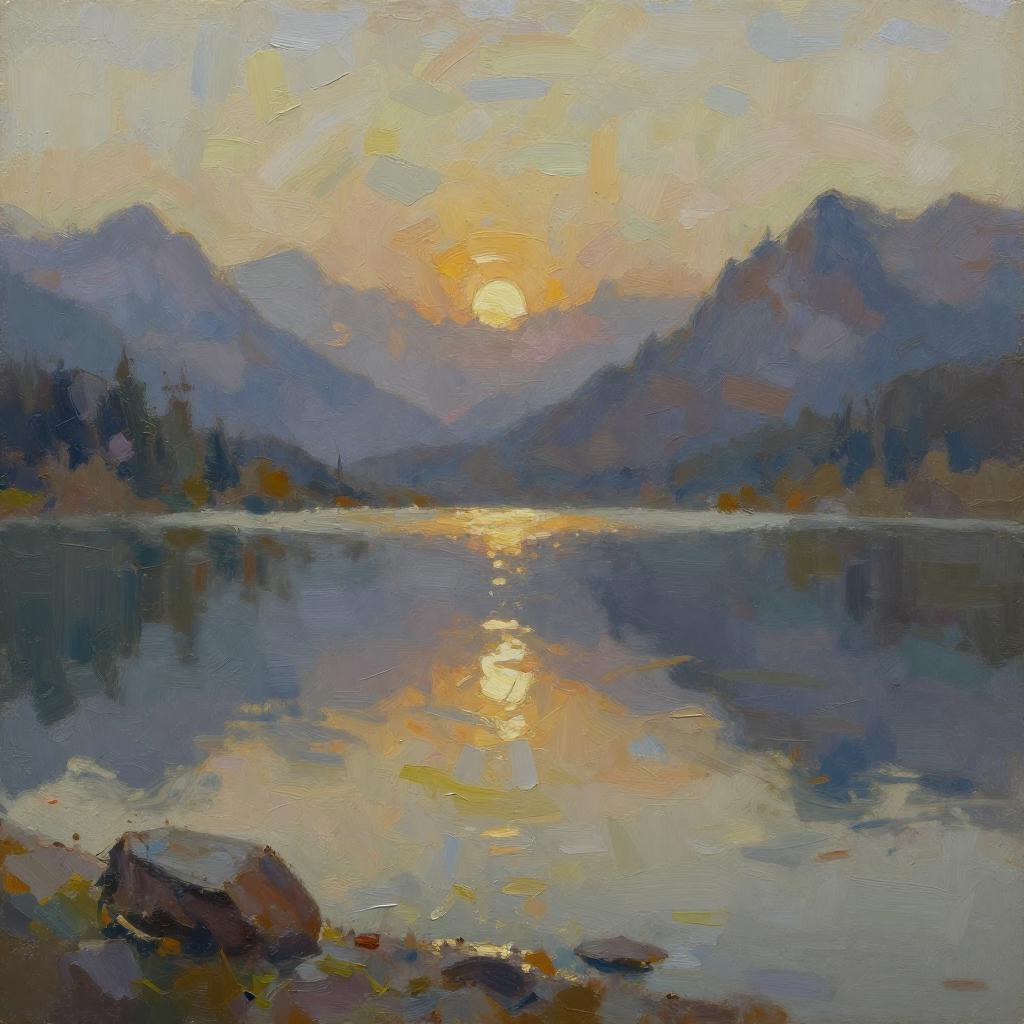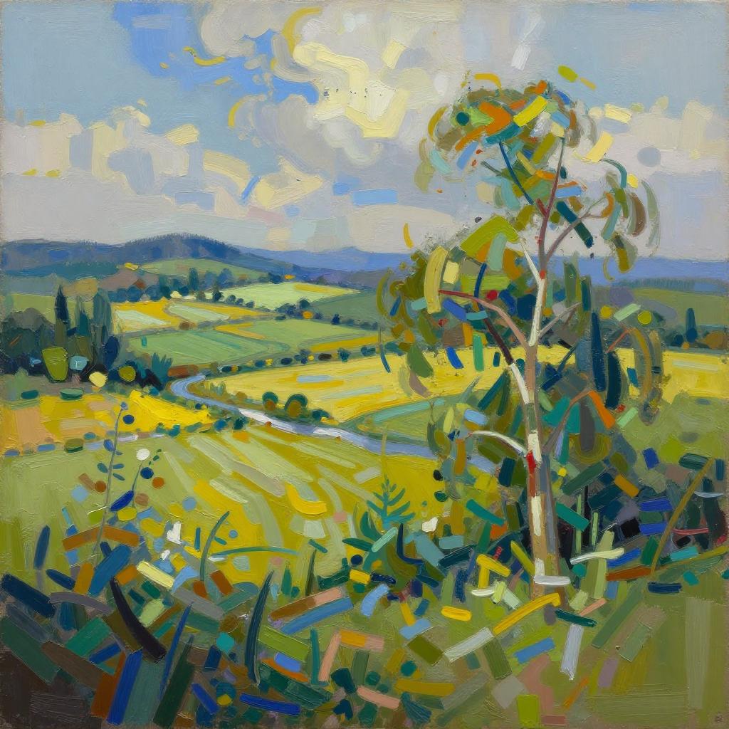 Vivid impasto painting featuring an autumn landscape with expressive brushstrokes, vibrant fall trees with red, orange, and yellow leaves, rolling green hills, and a curving river under a bright sun in a blue sky.
