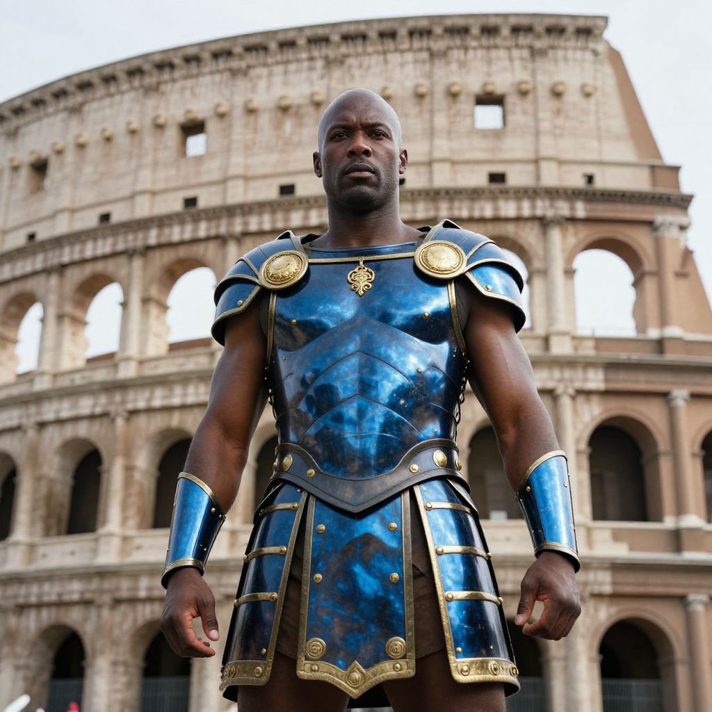 Photograph of a muscular Black man in shiny blue and gold gladiator armor standing before the Colosseum, with a serious expression.